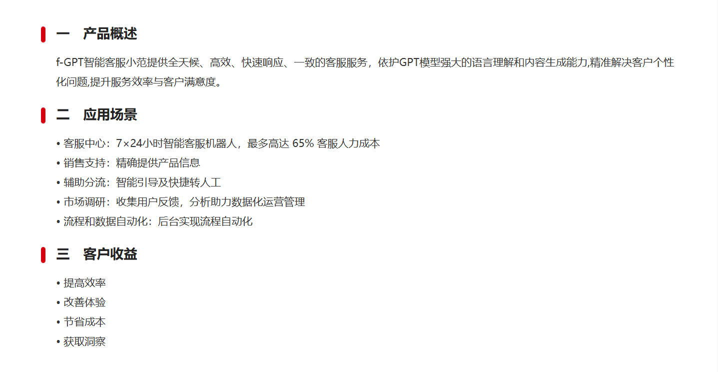 f-GPT智能客服小范提供全天候、高效、快速響應(yīng)、一致的客服服務(wù),依護(hù)GPT模型強(qiáng)大的語言理解和內(nèi)容生成能力,精準(zhǔn)解決客戶個(gè)性化問題,提升服務(wù)效率與客戶滿意度。