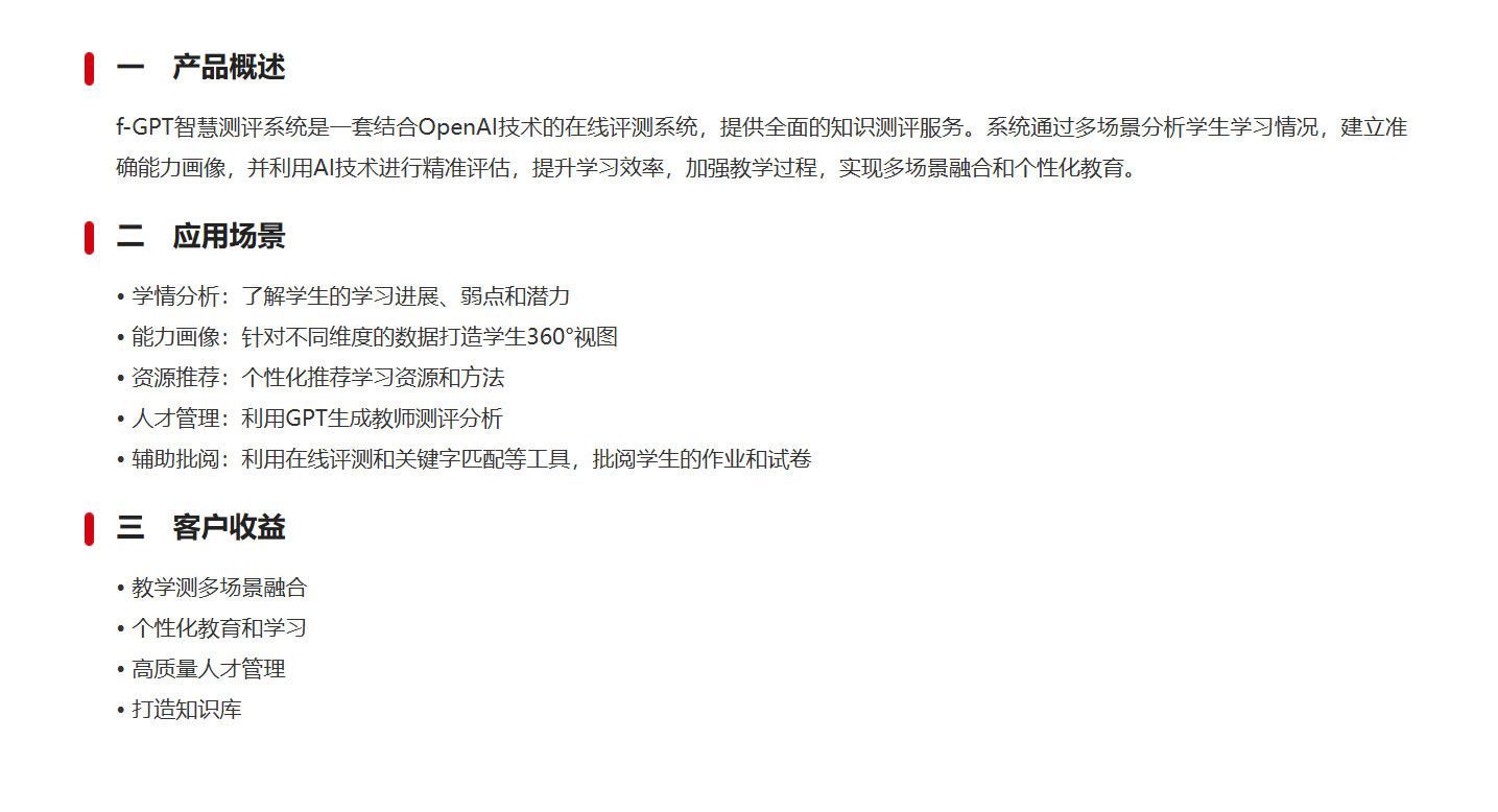 f-GPT智慧知識(shí)測評(píng)系統(tǒng)是一套結(jié)合OpenAI技術(shù)的在線評(píng)測系統(tǒng),提供全面的知識(shí)測評(píng)服務(wù)。系統(tǒng)通過多場景分析學(xué)生學(xué)習(xí)情況,建立準(zhǔn)確能力畫像,并利用AI技術(shù)進(jìn)行精準(zhǔn)評(píng)估,提升學(xué)習(xí)效率,加強(qiáng)教學(xué)過程,實(shí)現(xiàn)多場景融合和個(gè)性化教育。
